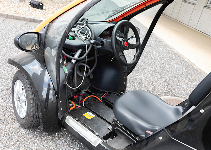 | 説明 | 市販の小型電動自動車です。荷台に計測器等を積むことで、実車運転時のドライバ運転操作や車両挙動の計測が可能です。例えば、運転支援システム構築に向けて、ドライバ感覚やドライバ状態の計測などに活用しています。 |