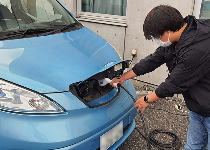 | 説明 | 再エネ発電量と同時同量のリアルタイム充電や効率的な走行方法の実験検証が可能。 車両情報計測データ(走行用バッテリ電圧、電流、車速、ステアリング角度、など)のCAN信号も計測できる。 |