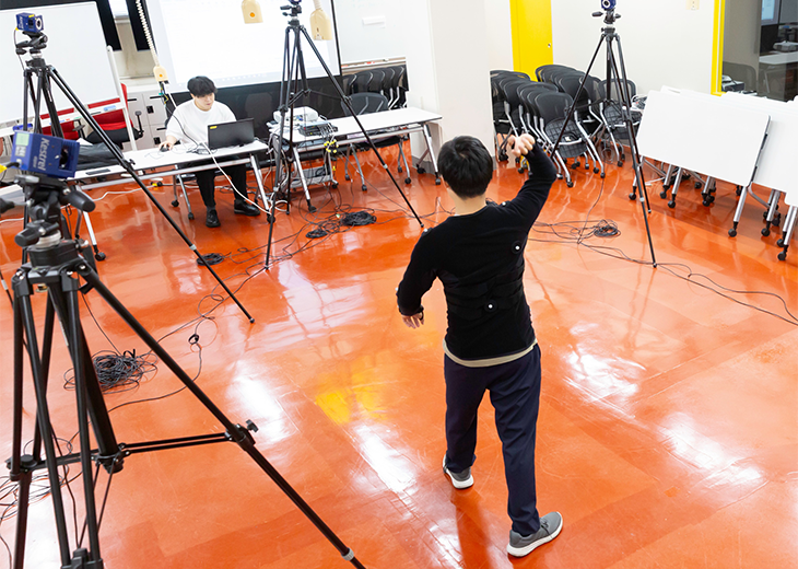 | 説明 | 赤外線カメラ12台と床に設置した2枚の反力計測装置によって、高精度な三次元位置計測と設定によっては筋骨格モデルの構築が可能です。ドライバの車載HMI操作時の動作解析、歩行者の動作解析、技術伝承に向けた佐官作業者の動作計測など、多様な研究に活用しています。 |