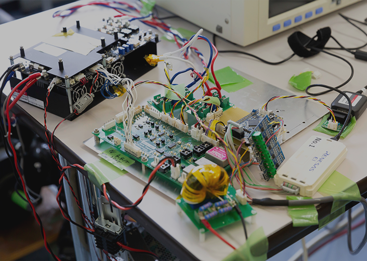 | 説明 | 任意のゲート信号で高周波スイッチングが可能な三相PWMインバータ、広帯域なパワーメータ、力行回生が可能なバッテリ模擬装置で構成されるパワートレインの電力評価装置。 |