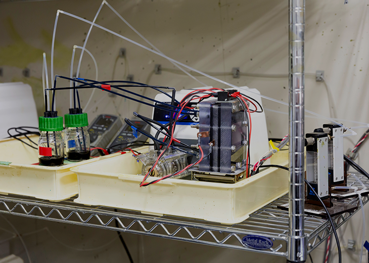 | 説明 | 直流電源電子負荷装置によりレドックスフロー電池のような二次電池の性能を評価する装置です。また,インピーダンスアナライザにより電池の交流インピーダンスを測定する事が可能です。 |