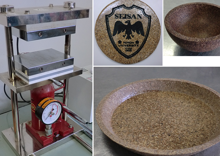 | 説明 | 最大荷重15ton、最大300度までの昇温可能な圧縮試験機で、単純な形状であれば金属金型も保有しています。落花生さやを使用した板やコースタ、皿の製作などの実績があります。。 |