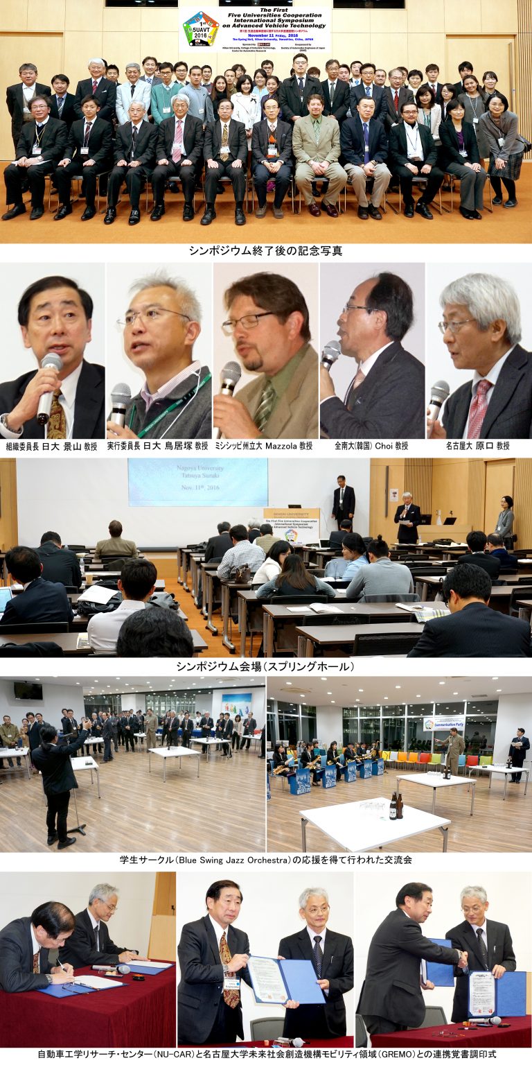 2016年11月11日に自動車工学リサーチ・センター(NU-CAR)主催の第1回先進自動車技術に関する5大学連携国際シンポジウム(5UAVT)が津田沼キャンパスで開催されました。本学,名古屋大学,同志社大学,全南大学(韓国),ミシシッピ州立大学(米国)および一般企業から約60人が参加されました。各大学のリサーチセンターの概要と研究トピックスの発表が行われ,自動車工学の将来展望と産学連携などについて情報交換が行われました。ご来場ありがとうございました。第2回はミシシッピ州立大学で来年開催予定です。また,NU-CARとGREMO(名古屋大学未来社会創造機構モビリティ領域)との連携覚書調印式がシンポジウム会場で行われました。
