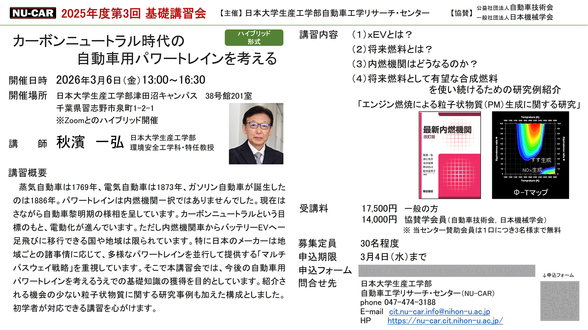 【終了】2026年3月6日(金) 「カーボンニュートラル時代の自動車用パワートレインを考える」秋濱一弘特任教授 HOMEイベント基礎講習会【終了】2026年3月6日(金) 「カー… 投稿日:2025.12.12 2025年度第3回基礎講習会「カーボンニュートラル時代の自動車用パワートレインを考える(秋濱一弘特任教授)」を2026年3月6日に開催しました。