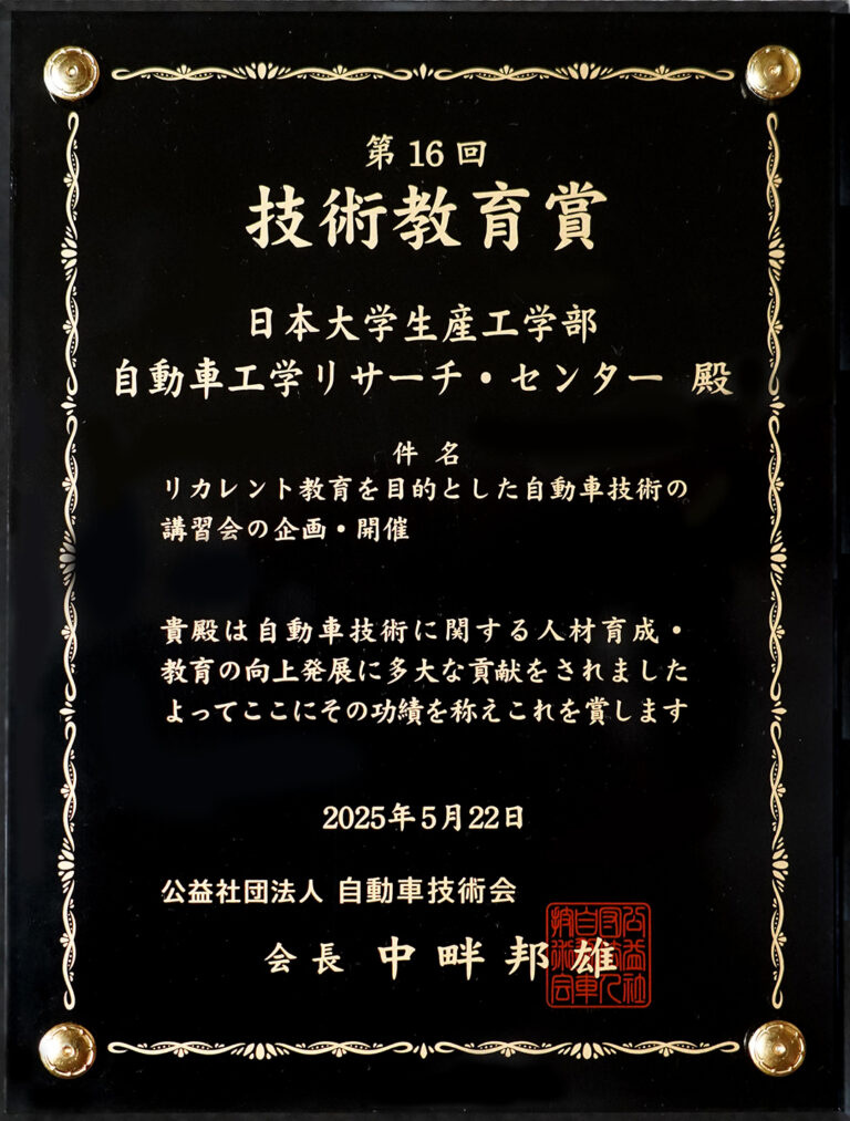 自動車工学リサーチ・センター(略称:NU-CAR)が、公益社団法人自動車技術会「第16回技術教育賞」を受賞しました。NU-CAR活動の1つである“リカレント教育を目的とした自動車技術の講習会(基礎講習会・出張講習会)の企画・開催”の実績が、今後の自動車産業界を支える人材の育成への功績として認められました。NU-CARメンバー、賛助会員様および受講者各位のご協力に厚くお礼申し上げます。授賞式は、2025年5月22日にパシフィコ横浜会議センターで執り行われました。